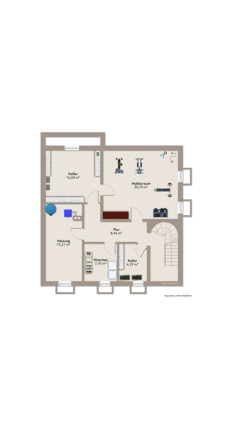 Der voll ausgebaute Keller erweitert die Nutzungsmöglichkeiten des Hauses erheblich. Neben zwei Kellerräumen und einem Waschraum steht ein großer Hobbyraum zur Verfügung, der sich ideal für Fitness, Werkstattarbeiten oder ein Spielzimmer eignet. Ein separater Heizungsraum ist ebenfalls vorhanden. Abgerundet wird das Angebot durch eine großzügige Doppelgarage, die bequemes Parken und zusätzlichen Stauraum ermöglicht.