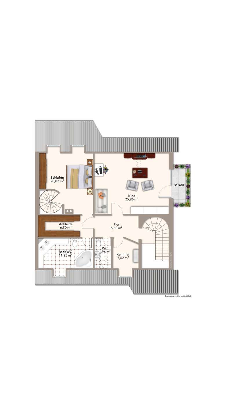 Im Obergeschoss erwartet Sie ein Rückzugsort mit durchdachtem Zuschnitt. Das große Schlafzimmer mit angrenzender Ankleide bietet höchsten Wohnkomfort, während das geräumige Kinderzimmer mit Zugang zum Balkon viel Licht und Platz zum Spielen, Lernen und Entspannen bietet. Ein Tageslichtbad mit Badewanne sowie ein zusätzliches WC ergänzen diese Etage. Eine praktische Abstellkammer schafft zudem weiteren Stauraum.