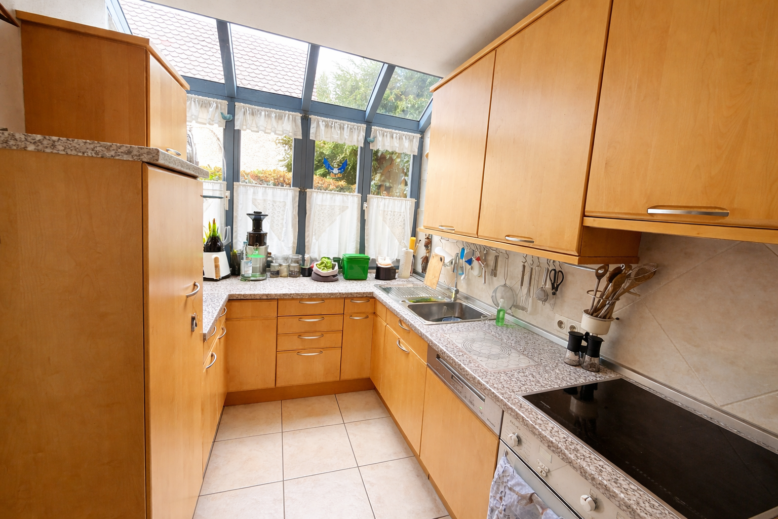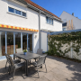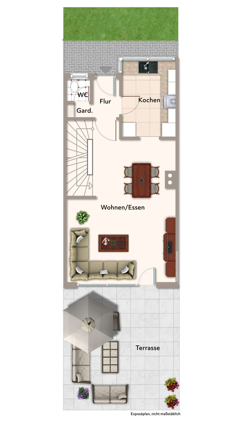 Im Erdgeschoss empfängt ein Eingangsbereich mit Garderobennische sowie Gäste-WC. Die separate Küche ist funktional geschnitten und könnte bei Bedarf zum Wohn- und Essbereich hin geöffnet werden, um ein modernes, offenes Wohnkonzept zu schaffen. Der helle Wohn- und Essbereich bietet Zugang zur vollständig gepflasterten Terrasse. Ein klassischer Garten ist nicht vorhanden, wodurch sich das Objekt besonders für Käufer eignet, die eine pflegeleichte Außenfläche bevorzugen.