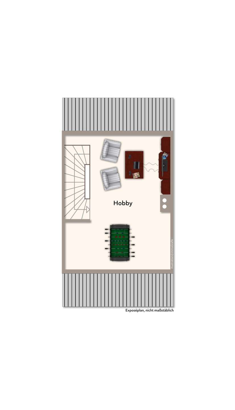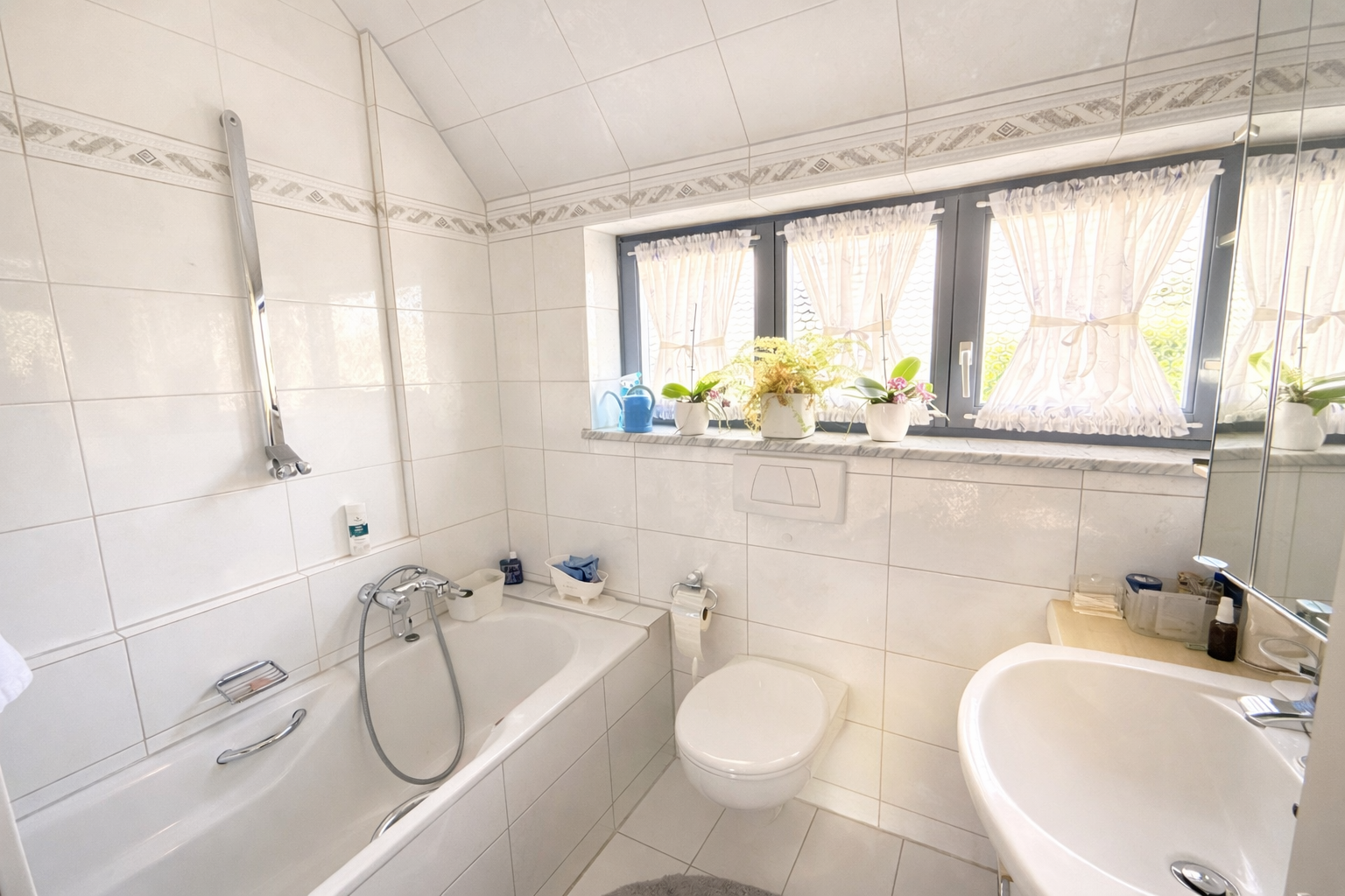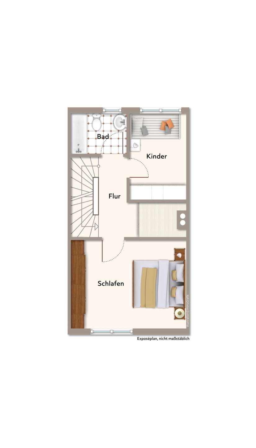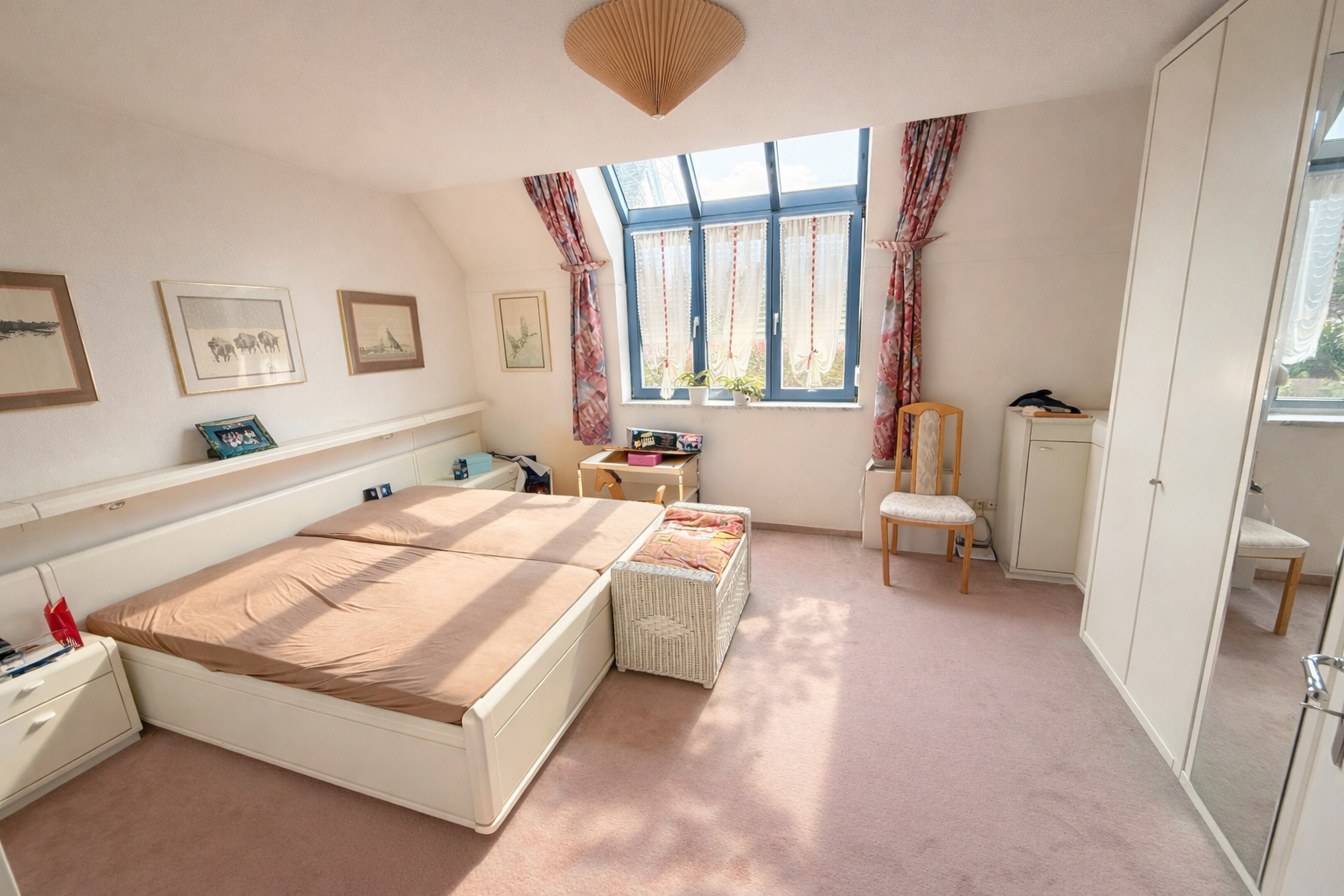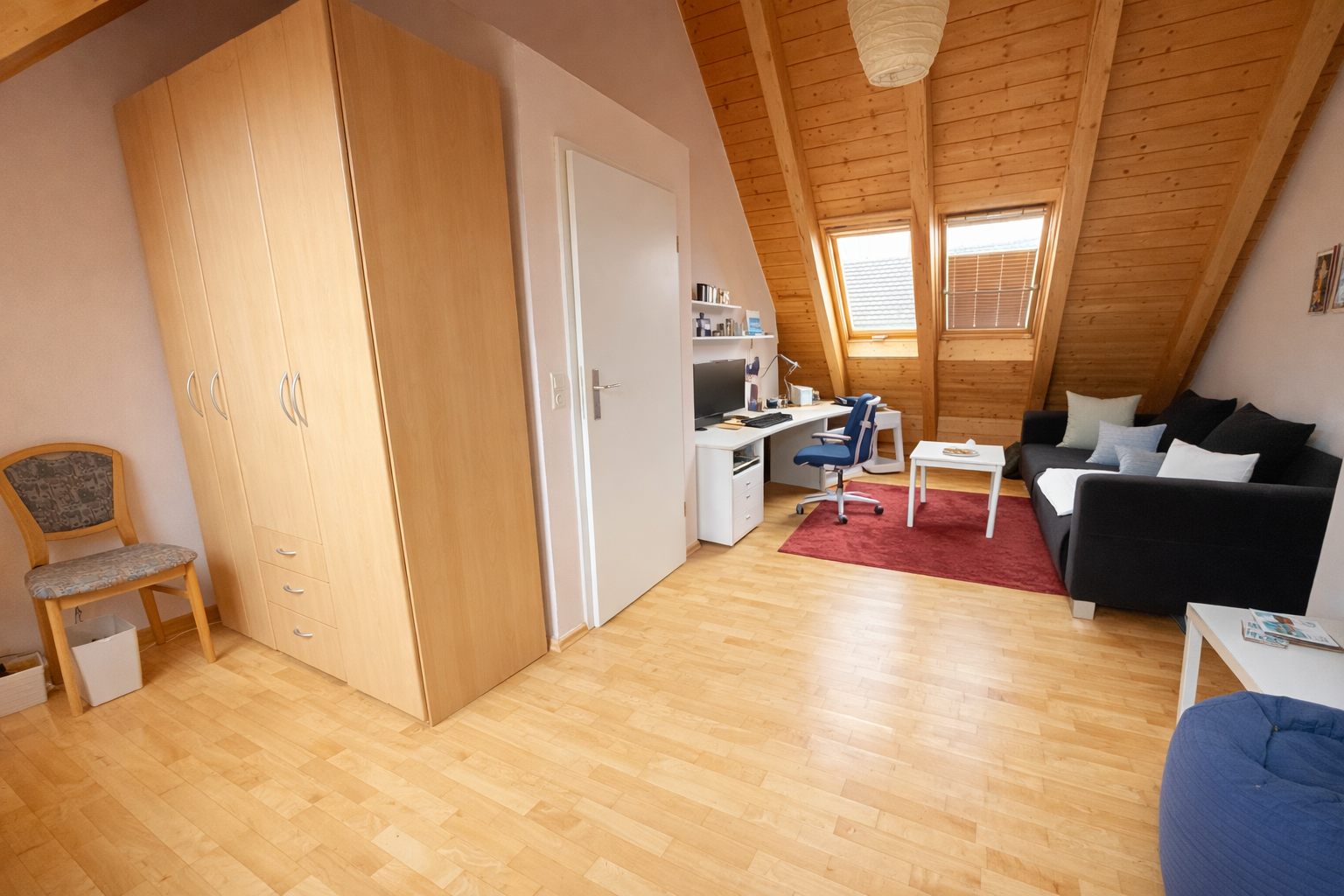 Im Obergeschoss befinden sich zwei Schlafzimmer sowie eine zusätzliche Zwischenfläche, die sich beispielsweise als Ankleide ausbauen oder alternativ zur Vergrößerung eines der Zimmer nutzen lässt. Das Tageslichtbad ist mit einer Badewanne ausgestattet. Das ausgebaute Dachstudio im Dachgeschoss schafft zusätzlichen Raum für Homeoffice, Hobby oder ein weiteres Schlafzimmer.
