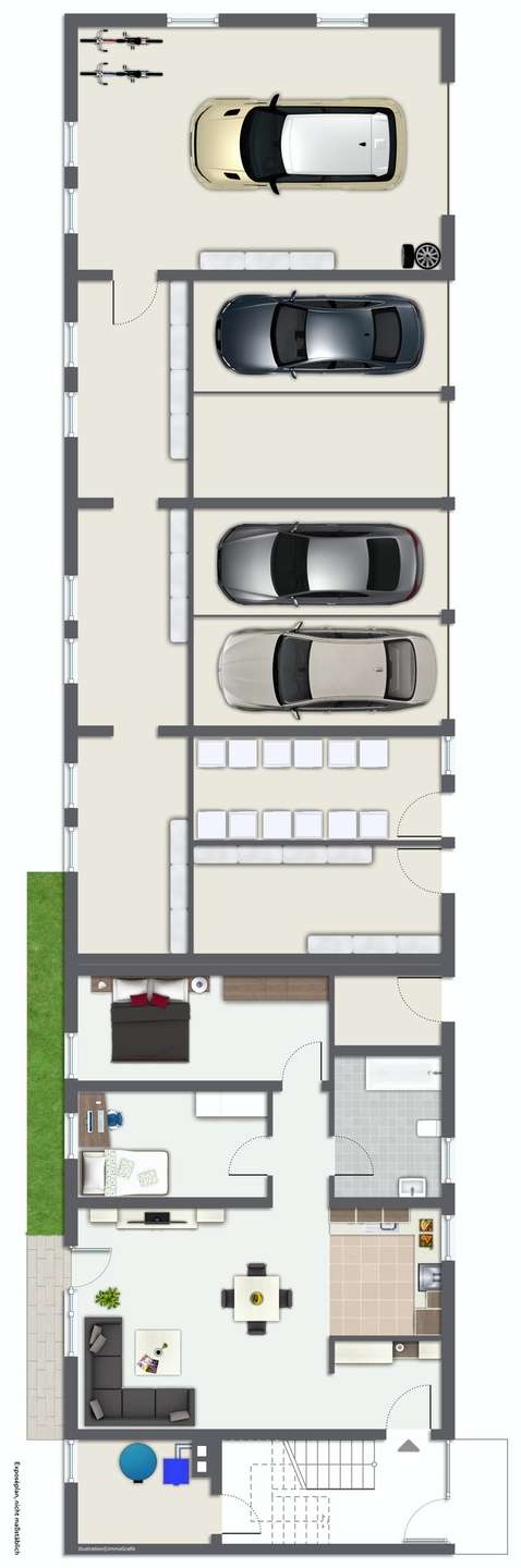 Ein echtes Plus! Der große Garagenbereich bietet zusätzliche Nutzungsmöglichkeiten und Einnahmen: