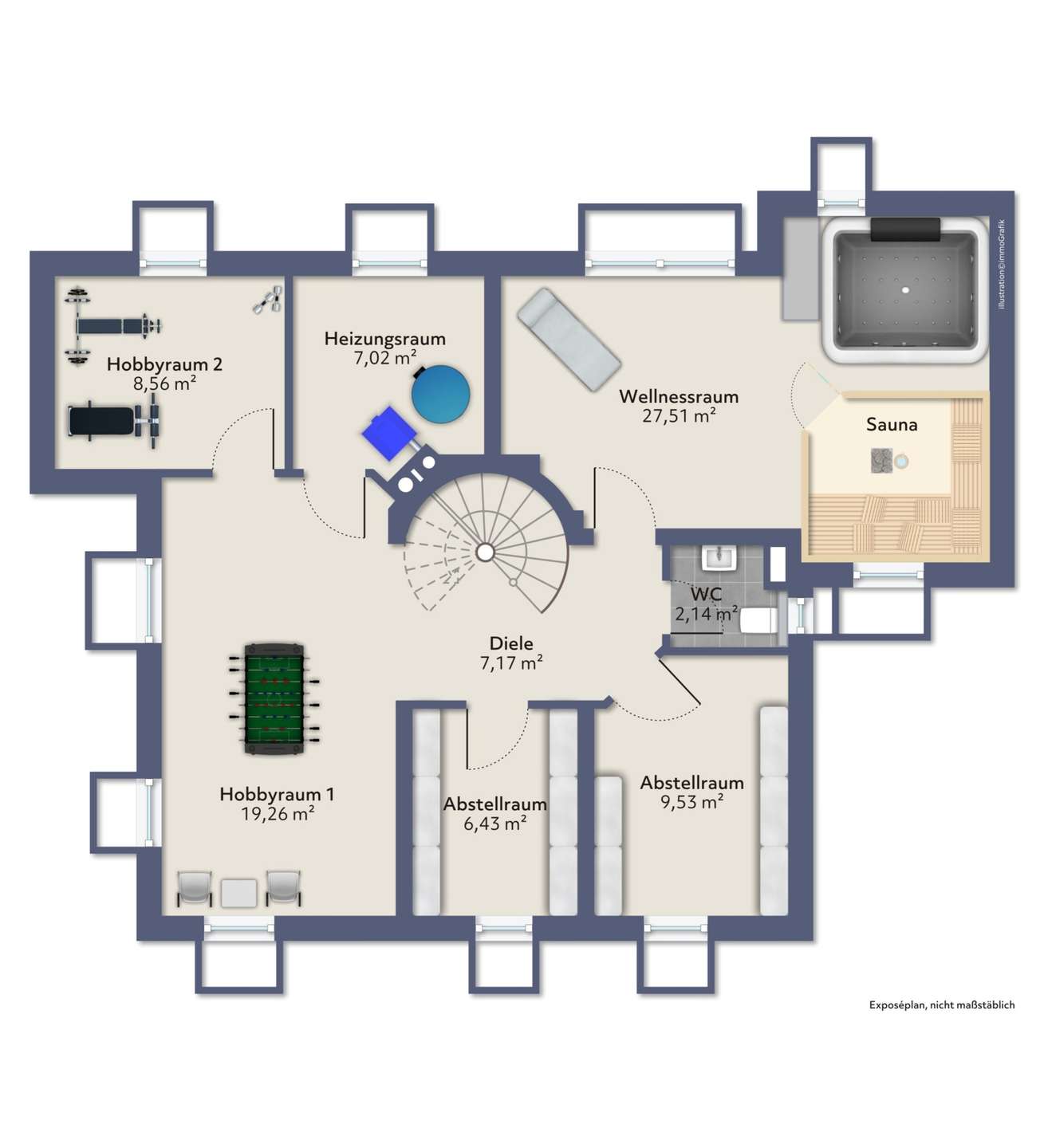 Die drei Bäder und zwei WCs sind durchgehend stilvoll und hochwertig ausgestattet, darunter ein Designerbad mit Acrylwanne, Duschtempel und ein exklusives Wellnessbad im Untergeschoss mit Dusche, Sauna, Ruhebereich und großem Whirlpool für bis zu sechs Personen.