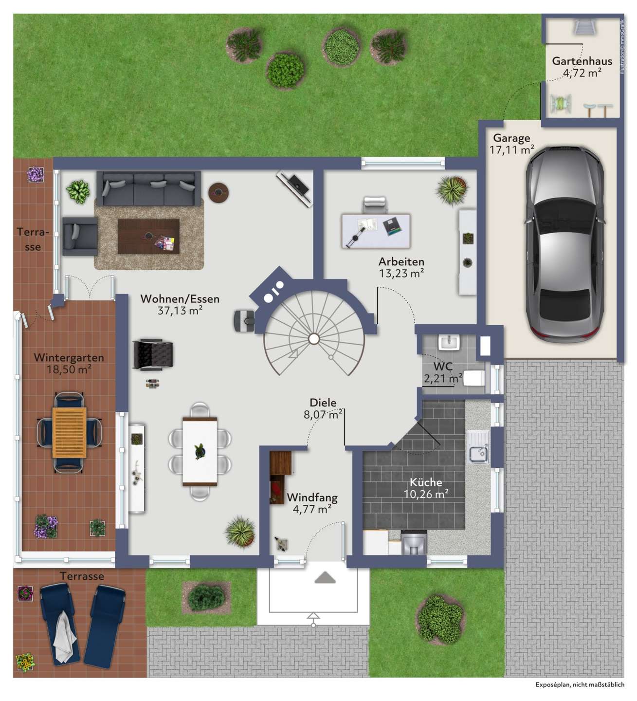 Das Haus liegt in einer verkehrsberuhigten Spielstraße in einer ruhigen und bevorzugten Wohngegend. Der sonnige Garten ist nach Südwesten ausgerichtet, angenehm eingewachsen und bietet ein hohes Maß an Privatsphäre. Ergänzt wird das Grundstück durch ein separates Gartenhaus und ein Fahrradhaus.
