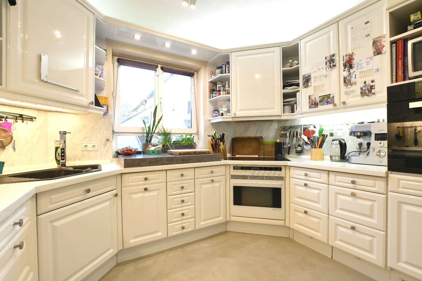Die helle Marken-Einbauküche ist mit modernen Geräten ausgestattet, inklusive großem Side-by-Side-Kühlschrank sowie je einem Backofen von Siemens und Miele. Eine zentrale Staubsaugeranlage mit drei Zugangspunkten sorgt für besonderen Komfort im Alltag.