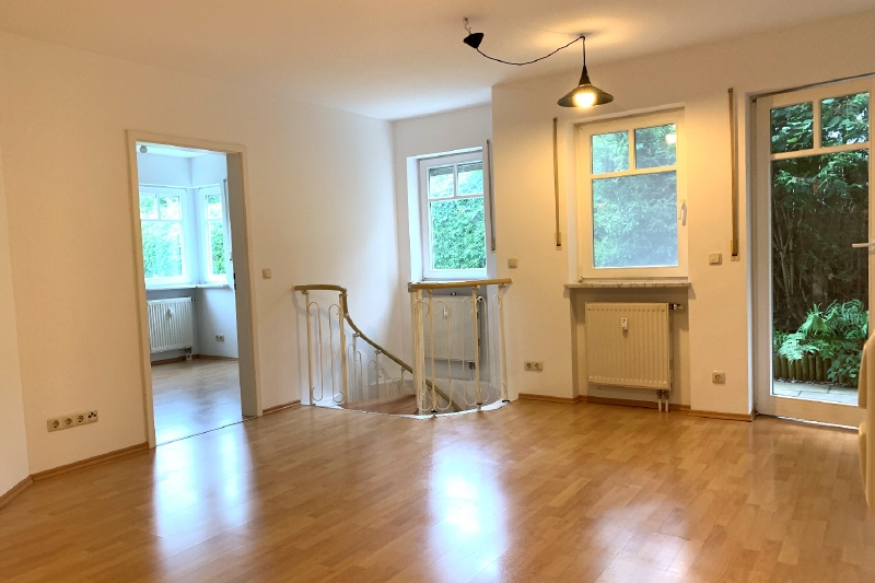 Die angebotene Wohnung befindet sich in guter Lage von München-Untermenzing! Betreten wird die Wohnung über einen kleinen Eingangsbereich von welchem aus Sie direkten Zugang zum offenen Wohn-und Essbereich, sowie zum Badezimmer, haben. Vom Wohnzimmer aus haben Sie zum einen Zugang zur Terrasse mit angrenzendem Garten, zum anderen gelangen Sie von hier über eine Wendeltreppe in den großzügigen Souterrain Raum. Im Erdgeschoss befindet sich zusätzlich ein weiterer Raum, den man als Schlafzimmer oder Arbeitszimmer nutzen kann, sowie die Küche, welche mit sämtlichen Einbauten zur Ablöse steht.