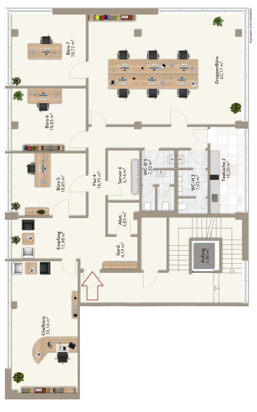 Der Eingangsbereich mit Empfang sorgt für einen professionellen ersten Eindruck und bietet direkten Zugang zu allen Büro- und Gemeinschaftsflächen. Neben einem großen Gruppenbüro für Teamarbeit stehen mehrere Einzel- und Doppelbüros zur Verfügung, die sich ideal als Rückzugsorte für konzentriertes Arbeiten oder als Besprechungsräume eignen. Ein repräsentatives Chefzimmer ergänzt die Fläche und unterstreicht den hochwertigen Charakter der Einheit.