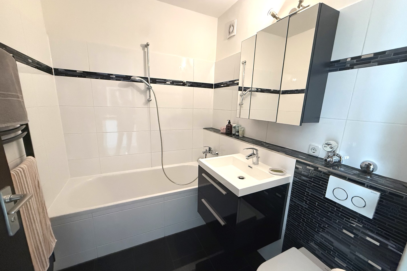* Modernisiertes Badezimmer mit Badewanne und stilvollen Fliesen